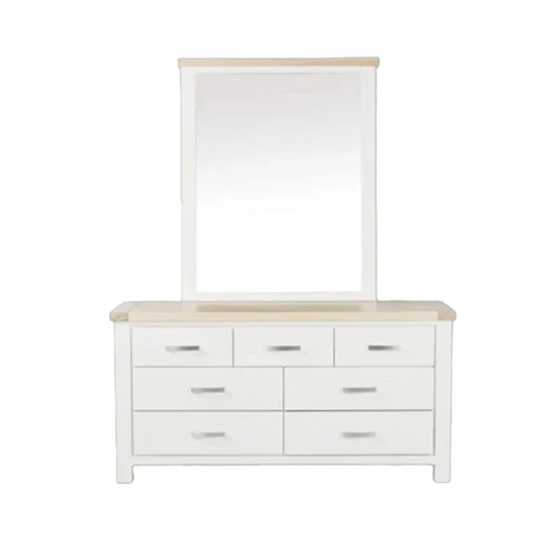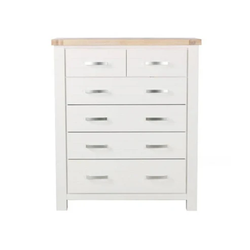 Utilizing solid timber, the range combines white painted Acacia wood with light Ash timber for a striking effect. Every piece is solidly built and adorned with polished silvery handles on all drawers, ensuring both durability and elegance.